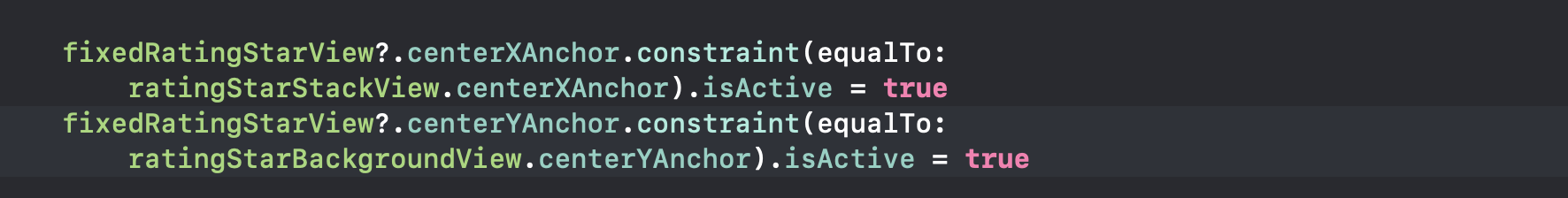 fixedRatingStarView는 별점뷰 인스턴스입니다. 위와 같은 설정 코드로 해당 변수의 중앙 X, 중앙 Y좌표의 제약 값을 소속 StackView의 중앙 X값, 소속 StackView하위 부모 View의 중앙 Y값과 일치시키도록 했습니다. 위와 같이 centerXAnchor, centerYAnchor 외에도 Leading / Trailing / Top / Bottom / Height / Width 등의 제약 값 또한 UIView의 옵션 값을 통해 코드로 구현할 수 있습니다.
