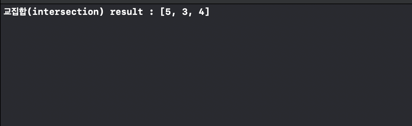 intersection 또한 Set 컬렉션의 인스턴스 멤버 메서드입니다. union과 같이 다른 Set 집합을 인자로 받으며, 두 Set 집합의 여집합 Set을 반환하게 됩니다.