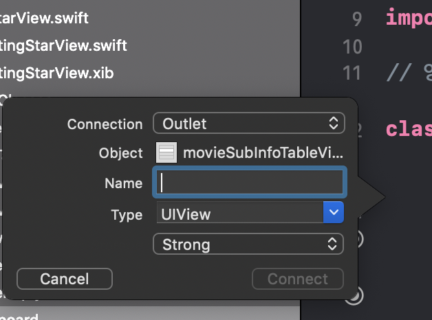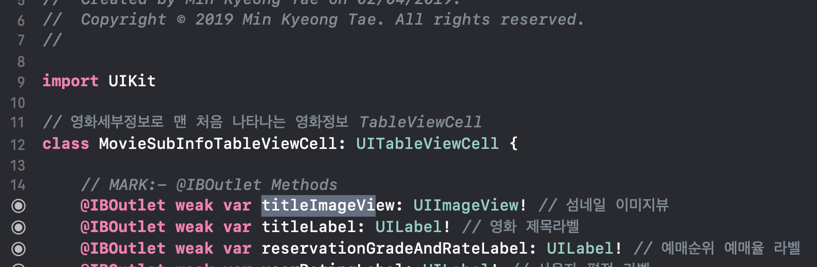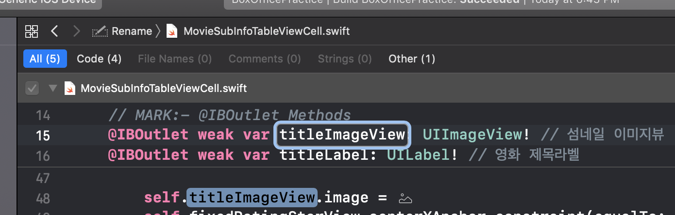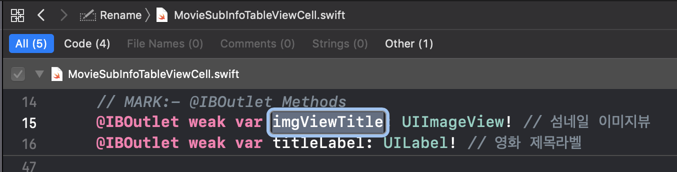 저는 위의 MovieSubInfoTableViewCell의 아울렛변수중 하나인 imgViewtitle을 => titleImageView로 이름변경을 하고싶습니다! 그렇다면 먼저 바꾸고자 하는 변수명에 커서를 갖다대구요.