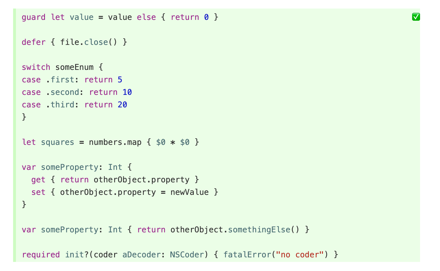 스위프트에서는 하나의 라인에 하나의 선언만 존재하도록 하는것을 권장합니다. "{}" 가 존재하는 경우를 제외하고는 한 라인 내에 선언되는 것이 일반적입니다.