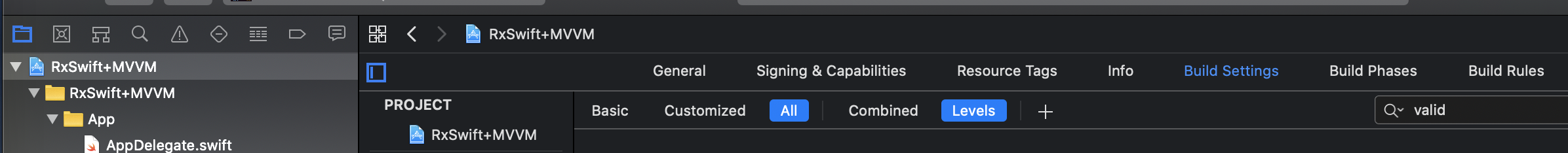 먼저, 좌측 파일 네비게이터의 프로젝트를 선택해서, Build Settings > valid (Architectures)를 검색해 줍니다.