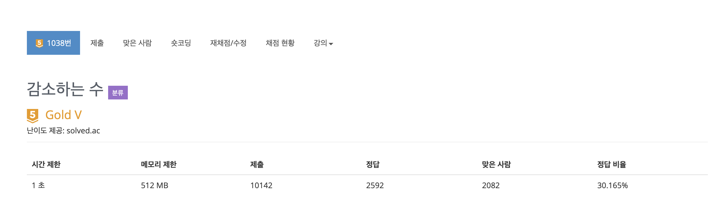 감소하는 수_1038 문제는 solved.ac 기준 골드5의 티어를 갖고 있습니다. 정답 비율은 30%입니다. 이어서 문제에 대한 설명을 보도록 하겠습니다.