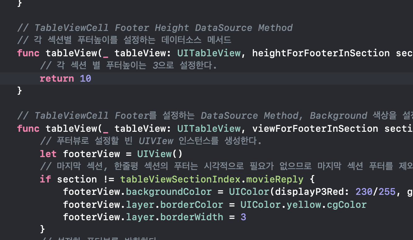 위는 테이블뷰의 푸터(테이블뷰 섹션의 맨 끝 꼬리셀)를 설정하는 모습인데요.