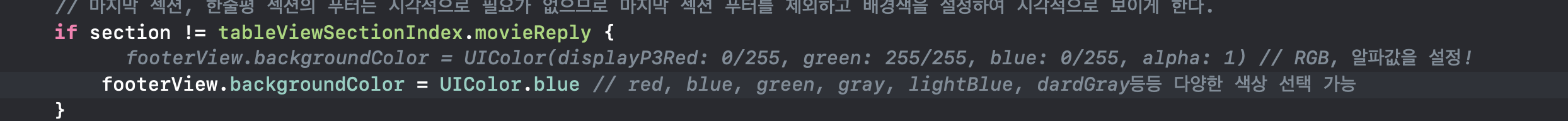앞서 말씀드렸듯이 표현방법은 footerView.backgroundColor = UIColor(displayP3Red: 빨강값, green: 초록값, blue: 파랑값, alpha: 투명도)를 넣으면 되는데요.