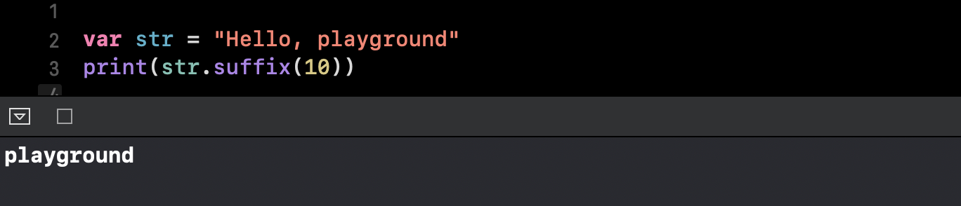 str변수는 String 타입이자 Bidirectional Collection이기에, suffix(_:)메서드를 접근하여 사용할 수 있습니다. 위의 코드는 str문자열의 뒤에서 10자리의 문자열을 반환하여 출력하는 코드가 되겠습니다.
