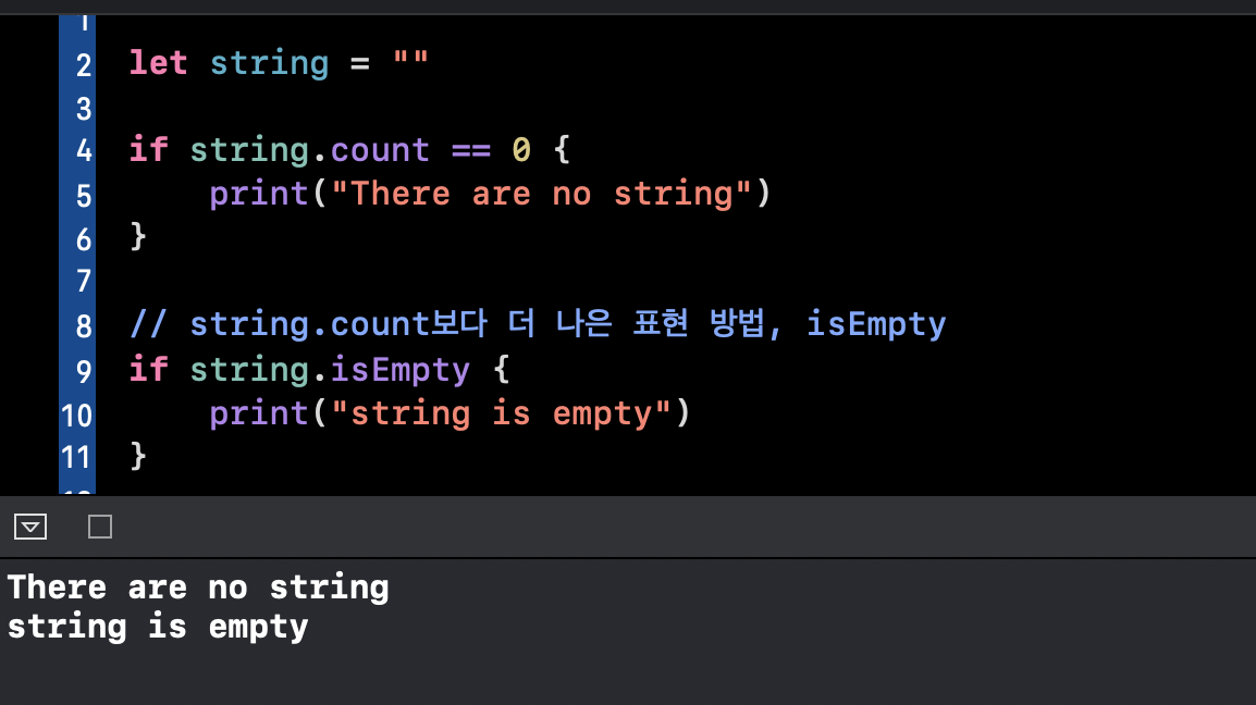 이와 비교해볼 때, isEmpty는 단 한번의 간단한 체크로 true나 false를 반환할 수 있습니다. 단지 문자열의 첫 인덱스가 끝 인덱스와 같은지를 비교할 뿐이빈다. 이러한 연산은 단 한번의 연산으로 끝나며 시간복잡도는 O(1)입니다. 이런 점에서 isEmpty 연산은 count 연산과 큰 차이를 보이게 됩니다.