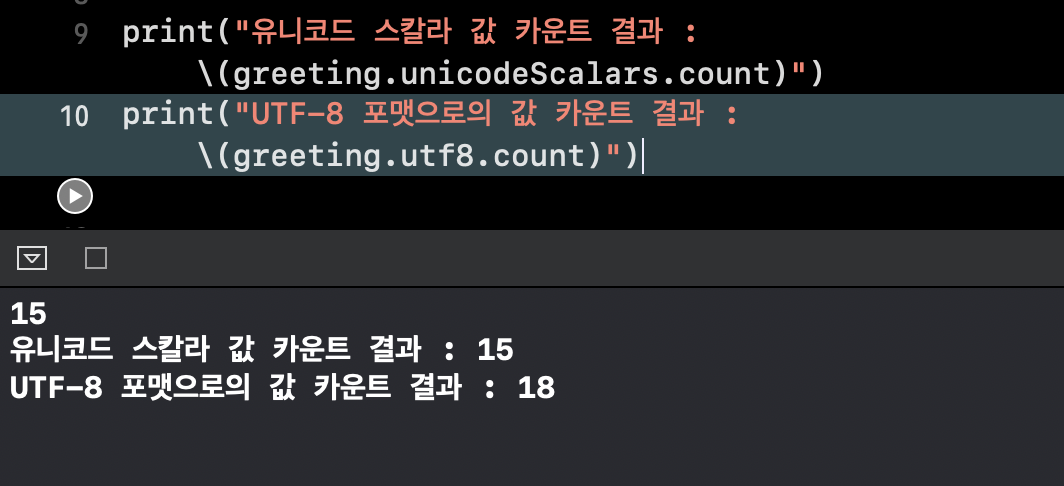 Swift에서의 String 문자열은 해당 문자열을 구성하는 문자들이 각각 하나 혹은 그 이상의 유니코드 스칼라 값으로 구성되어 있기 때문에, Character의 갯수가 유니코드 스칼라 값과 동일하지 않을 수 있습니다.