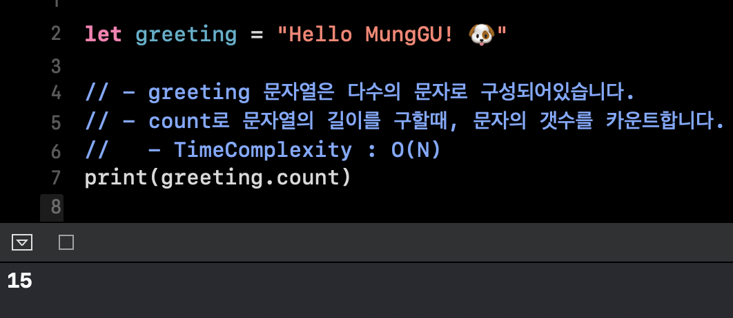 그렇기에, String의 길이를 잴때는 첫번째 문자부터 차근차근 밟아가면 문자 갯수를 카운팅하며, 이런 이유로 String의 count 시간복잡도는 일반적은 컬렉션과 달리 O(N)이 됩니다.