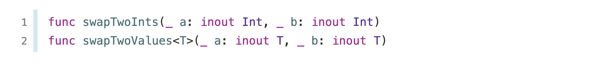 위의 swapTwoValues(_:_:) 메서드는 어떠한 타입이던 동일한 타입이기만 되는 두개의 인자를 받아서 값을 swap할 수 있습니다. 다양한 타입을 스왑하기 위해 다수의 메서드를 작성할 필요가 없게 되는 것입니다. 기존에 Int타입으로만 한정해서 받은 메서드, swapTwoIntValues(_:_:)메서드와 비교해서 몸체 내부의 구현 코드는 별다른 차이가 없습니다.
