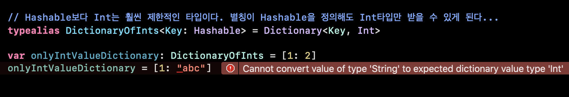 위의 경우, 값 타입을 Hashable로 지정하려는 별칭타입, DictionaryOfInts였지만, 원본 값 타입이 더 좁은 범위의 타입인 Int이므로, Int로서의 역할밖에 수행할 수 없는 모습을 볼 수 있습니다.