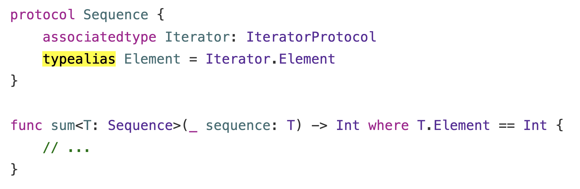 typealias를 사용하지 않았다면, sum 메서드는 T.Iterator.Element라는 타입을 모두 명시해줘야했을 것입니다. 하지만 typealias를 활용하면 간결하게 T.Element만 명시해서 사용할 수 있습니다.