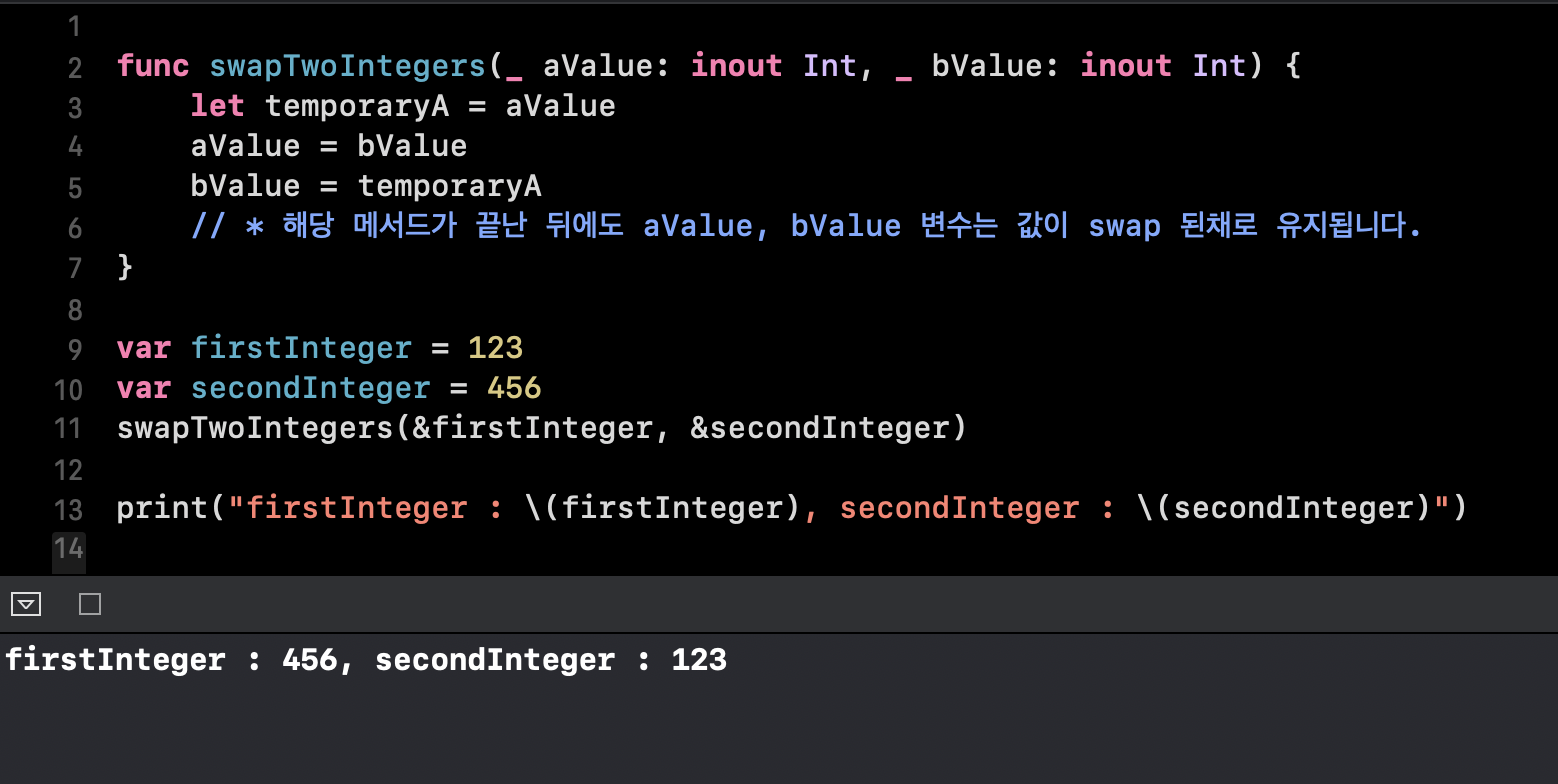 먼저, 메서드의 in-out 인자값으로 사용 될 두개의 변수가 선언됩니다. firstInteger, secondInteger입니다. 해당 값을 swapTwoIntegers 메서드의 in-out 매개변수로 사용되었으며(이 때 넘겨진 변수의 앞에 '&'를 붙여줍니다.), 메서드에서 swap된 값은 메서드가 종료한 뒤에도 원본값에 적용됩니다.