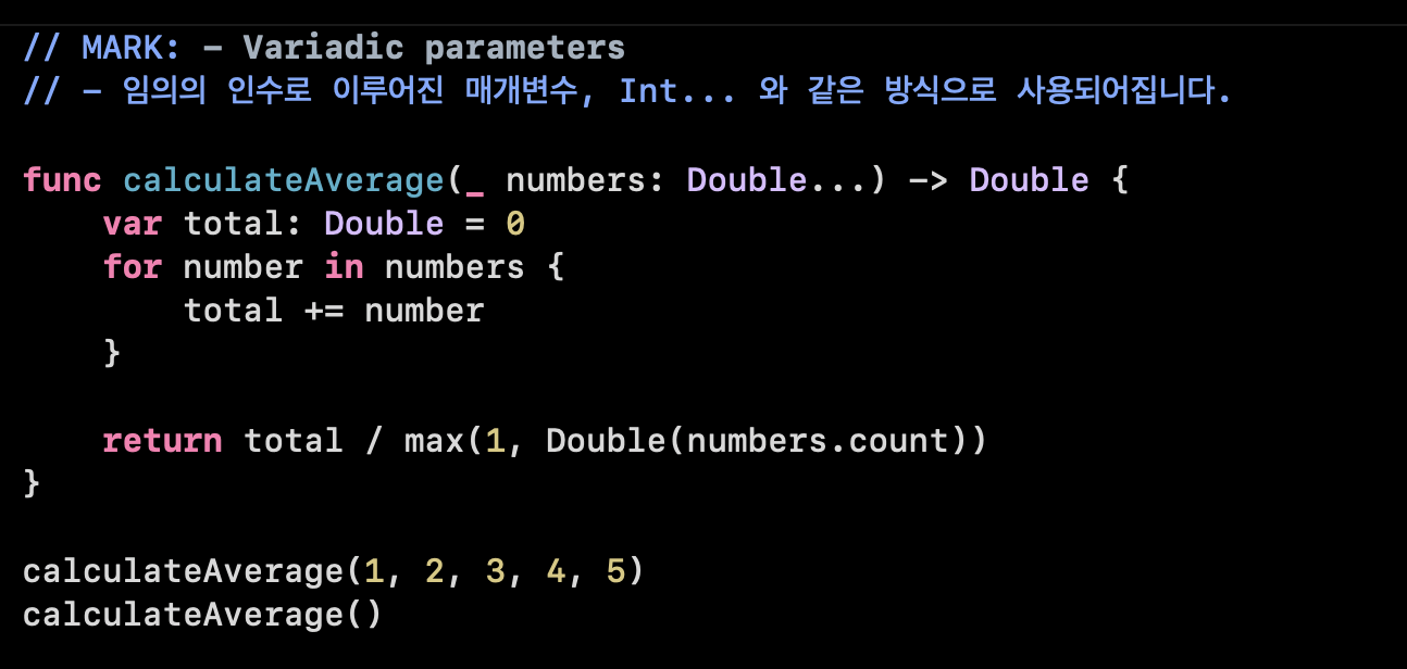 즉 해당 매개변수는 [] 일수도, [3.14]일 수도, [1, 2, 3]이 될 수도 있습니다. 이렇게 받은 Variadic 매개변수의 총 합을 구한 뒤, Variadic 매개변수로 나눈 평균값을 반환하고 있습니다. (단, Variadic 매개변수는 위의 코드에서 볼 수 있듯이, 인자값이 없을 수도 있습니다. 이 경우, 평균값 연산 시 NaN(Not a Number)가 될 수 있으므로, 값이 없을 경우 1로 나눌 수 있도록 max메서드를 사용했습니다.)