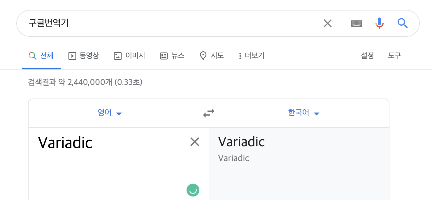 위와 같이 그 뜻을 한국어로 알려주지를 않는 모습입니다.(구글번역기알못) 😢 결론적으로 Variadic의 뜻을 보자면, "임의의 갯수 인수를 받을 수 있는" 이라고 할 수 있습니다. "임의의 갯수를 받을 수 있다" 라는게 어떤 것인지 밑에서 보도록 하겠습니다.