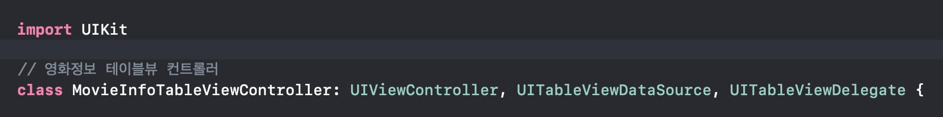 // 영화정보 테이블뷰 컨트롤러 라고 주석을 설정하였습니다. 위처럼 주석으로 설정한 경우, 앱 실행중에 해당 주석코드는 작동하지 않습니다. 코드가 어떤용도로 사용되고 어떤 목적을 갖고 있는지 설명하는데 사용할 수 있게 되는 것 입니다.