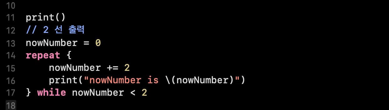 스위프트에서 do-while을 사용해보지 않은 분들은 생소하실 수 있지만, repeat-while이 do-while과 유사하다는 부분만 인지하시면 사용에 불편함은 없으실 겁니다. ^-^//