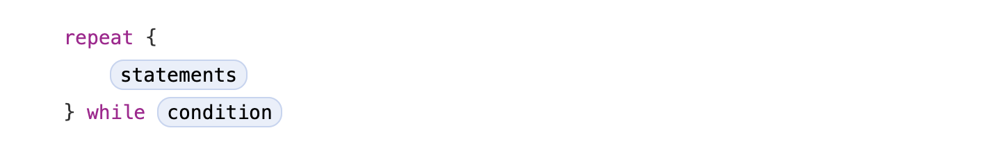 위와 같이 먼저 초기 1회 선 실행 및 조건에 따라 반복 실행할 코드는 블럭 안에 들어가며, 그에 앞서 repeat 예약어를 붙여줍니다. 블럭 끝에는 초기 1회 실행 후 거칠 루프 조건문을 while {조건문} 방식으로 정의합니다. repeat-while문의 구조 또한 do-while문과 매우 유사한 것을 알 수 있습니다.