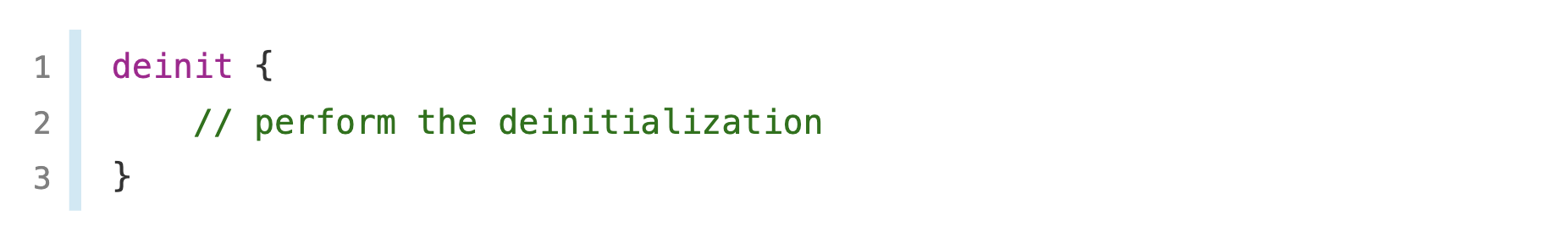 스위프트의 소멸자는 deinit 키워드를 사용해서 사용할 수 있습니다. 그 작성방식은 생성자인 init와 유사합니다. 스위프트 소멸자는 구조체가 아닌 클래스 타입에서만 작성 가능합니다.