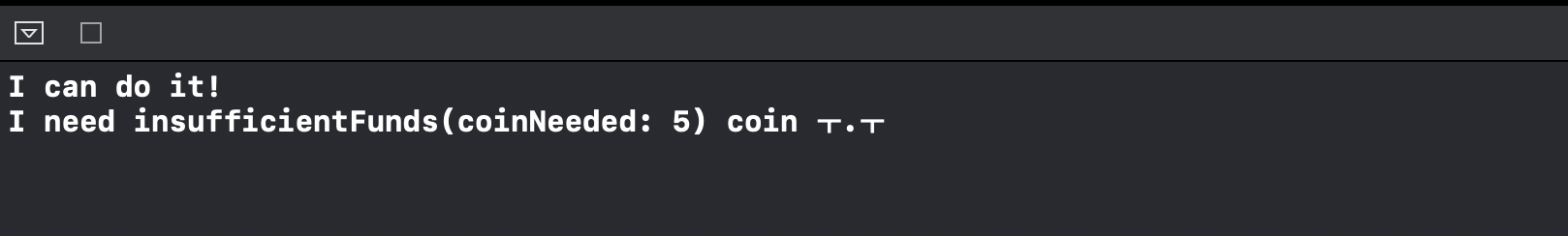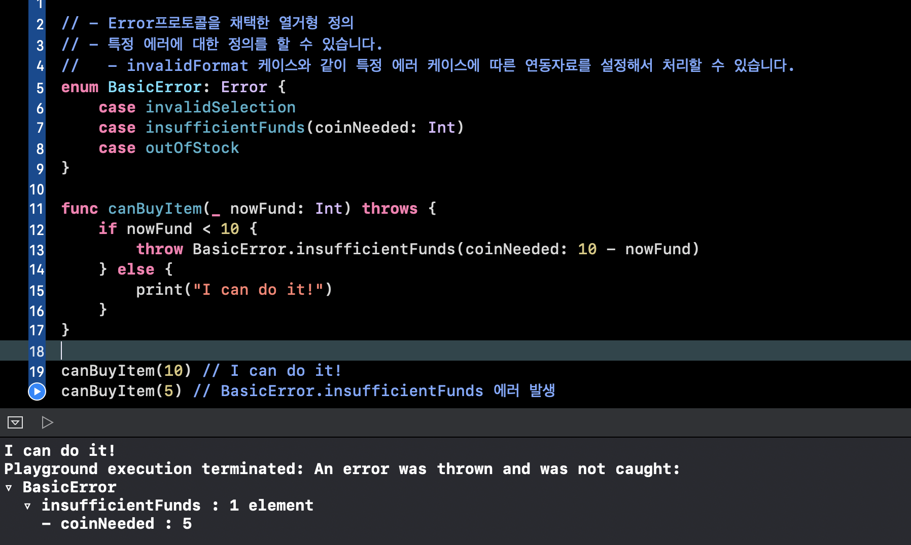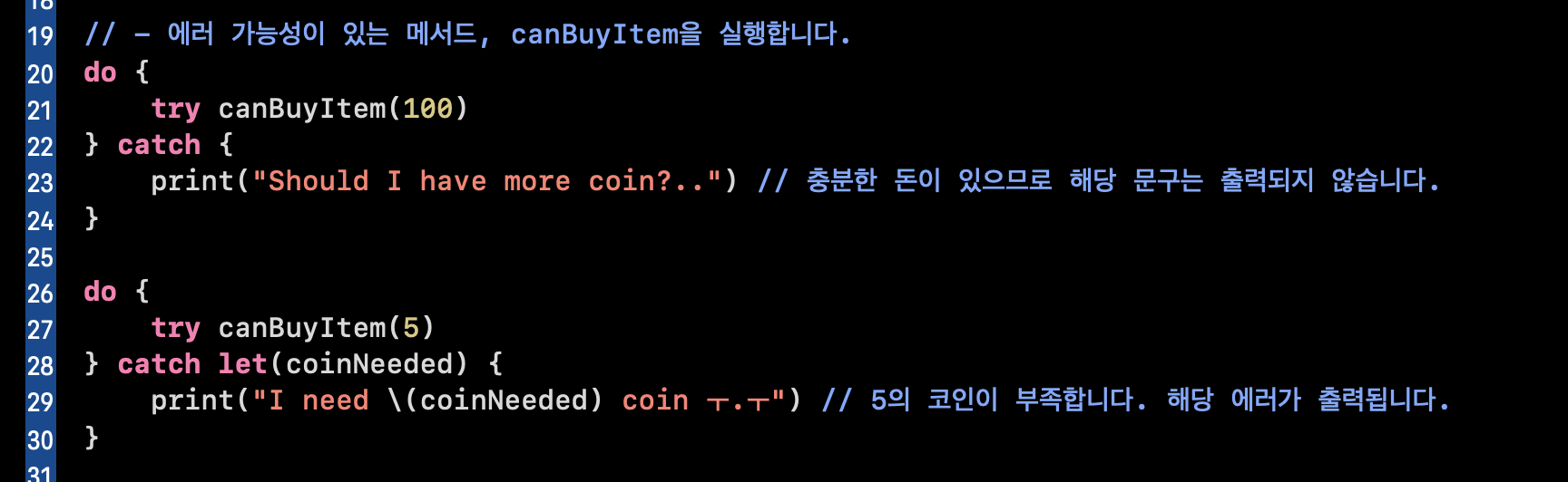 이러한 throws를 명시한 메서드를 do-try catch문 혹은 try? 등을 통해서 실행하고 예외처리를 수행할 수 있습니다. 그 예시는 아래와 같습니다.