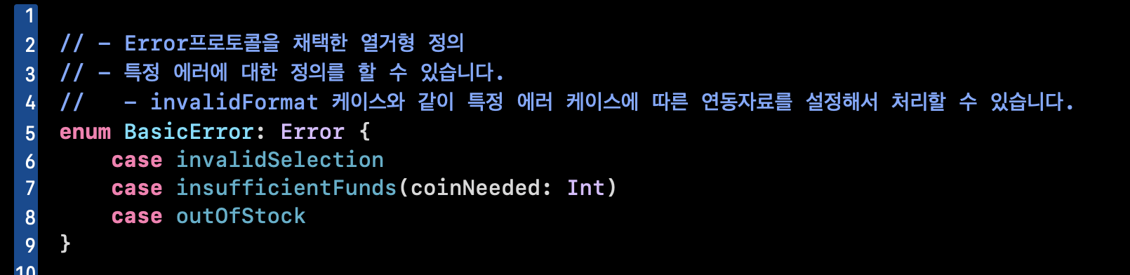 이때 Swift에서 지원하는 열거형 타입(Enumerations)는 다양한 경우의 에러에 대한 모델링에 딱 맞는 타입입니다. 열거형을 사용하면 연동자료를 인자로 받는 방식으로 발생할 수 있는 에러들에 대한 추가적인 정보까지 참고할 수 있습니다. 그 예시로, 아래는 특정 에러에 대한 다양한 케이스를 정의한 예시가 됩니다. 그 중 아래의 BasicError 열거형에서 정의한 케이스 중 insufficientFunds 에러는 coinNeeded 라는 인자를 갖고 있으며, 해당 에러가 발생할 때 에러 상황에 맞게 coinNeeded 값을 함께 설정할 수 있습니다.