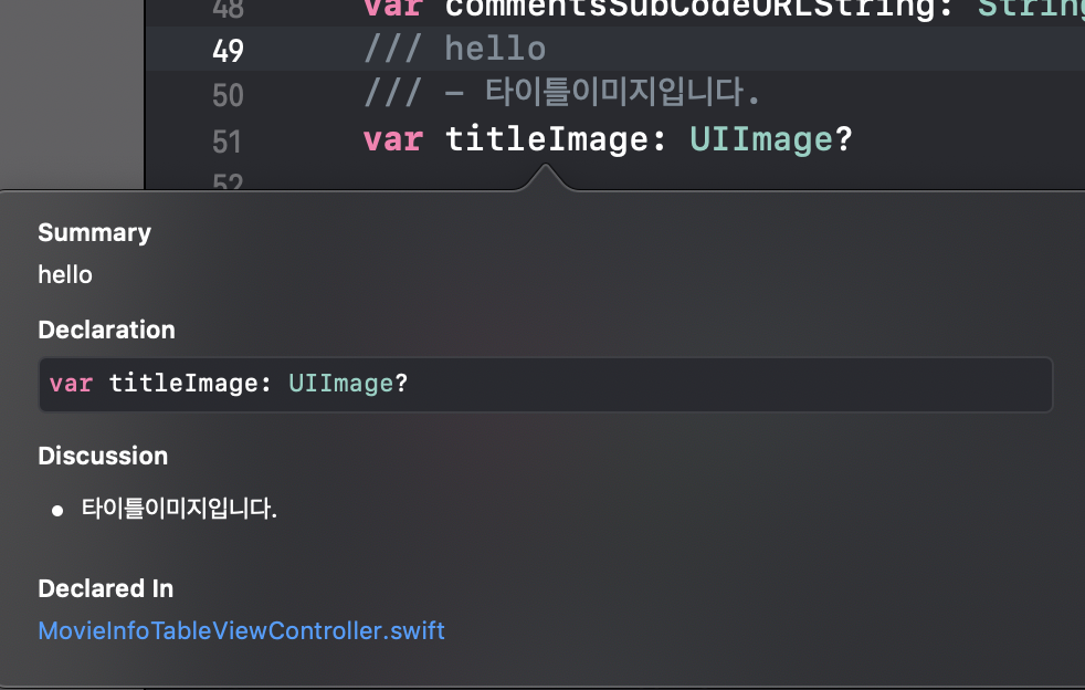 "///" 주석부에 "-영화정보를 담는 테이블뷰입니다 ^-^" 를 적고나서 해당 변수의 QuickHelp를 열어봤습니다. 다시 Option + 변수명 클릭!
