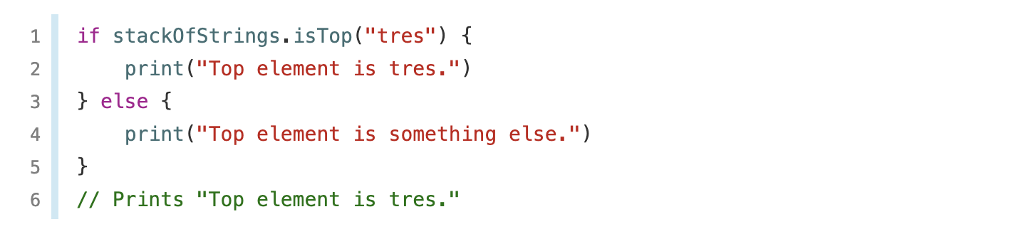 만약 Equatable하지 않은 타입의 Stack 인스턴스일 경우, 비교연산자를 사용할 수 없으므로, isTop 메서드를 사용하려 할때 컴파일 타임 에러를 보게 됩니다. 😢