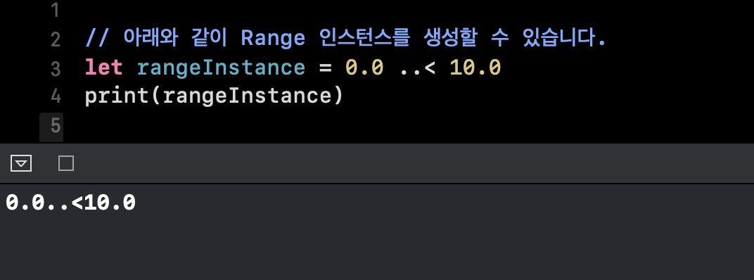 반개방 형태의 연산자, (..<) 를 통해 Range 인스턴스를 만들어 사용할 수 있습니다. 그 생성 예시는 아래와 같습니다.