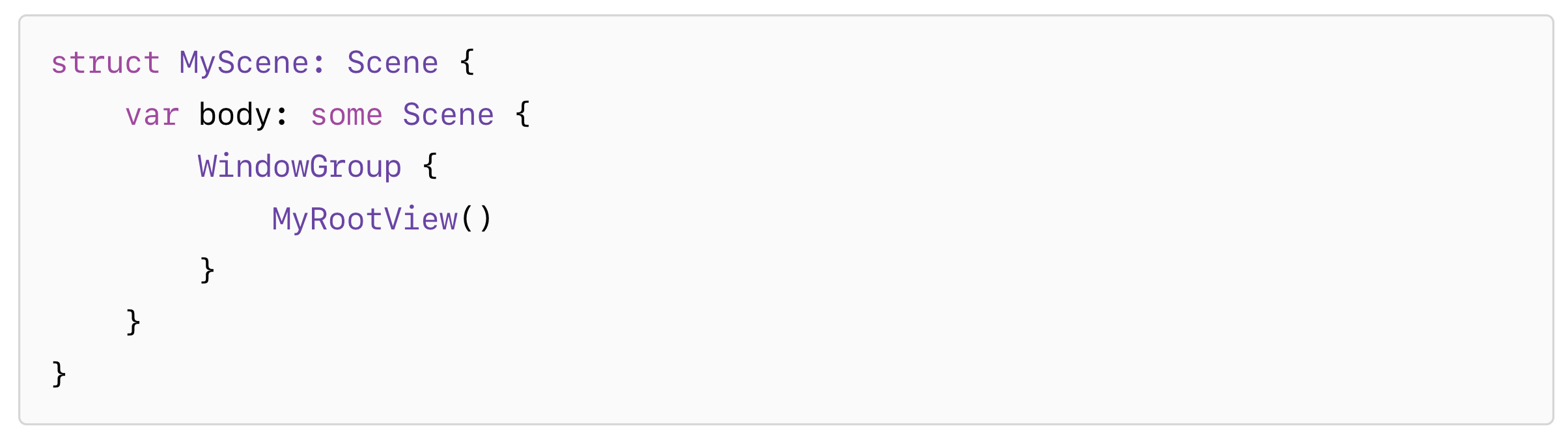 Scene은 개발자가 유저에게 보여주고싶은 뷰 계층을 설계하기 위한 컨테이너로서 동작합니다. 시스템은 현재 앱 상태에 맞게 언제, 어떻게 현재 플랫폼에 적당한, 동작을 수행하고, 유저 인터페이스 상의 뷰계층을 표현할지를 결정하게 됩니다. 그 예를 들자면, 위에서 보여진 WindowGroup을 위해서 시스템은 유저가 macOS, iPadOS 등의 플랫폼 상에서 MyRootView를 포함한 윈도우들을 생성 혹은 삭제하는것을 지원합니다.