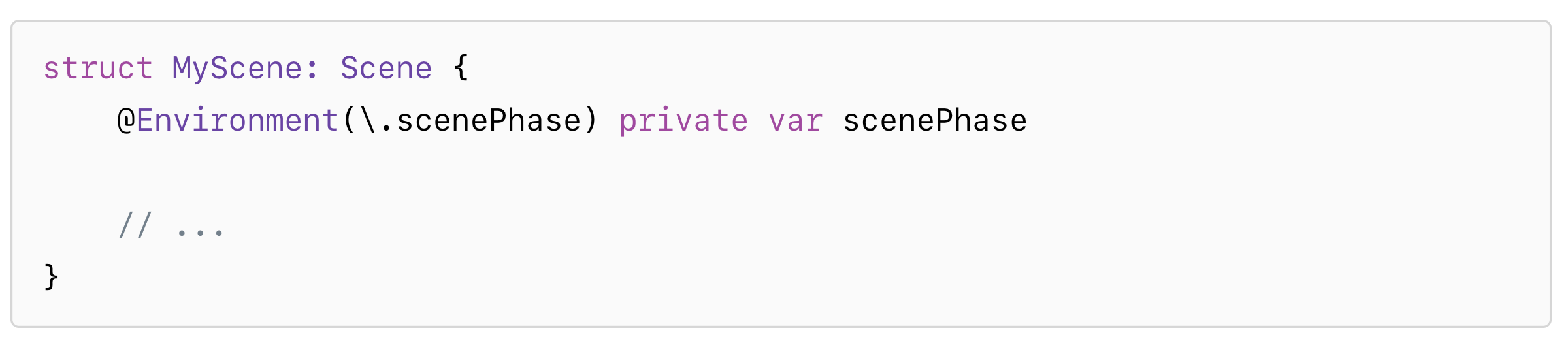 Scene이 active상태 혹은, 그 외의 상태인지를 판단하기 위해 Scene이나 View들 중의 하나에서 scenePhase라는 환경 값을 참고할 수 있습니다. 개발자는 scehePhase를 포함한 프로퍼티를 생성할 수 있는데요. 이는 열거형 타입인 ScenePhase의 값들 중 하나입니다. ScenePhase 값은 @Environment를 사용해서 생성할 수 있습니다. 그 생성 방법은 아래와 같습니다.