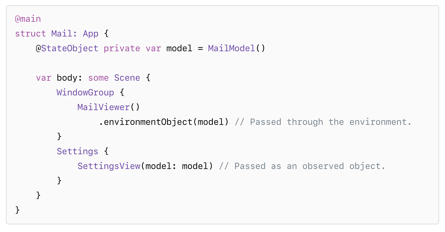 그리고 이때 뷰 입력에 해당 모델을 ObservedObject나 EnvironmentObject로서 앱 내의 Scene으로 제공할 수 있습니다.