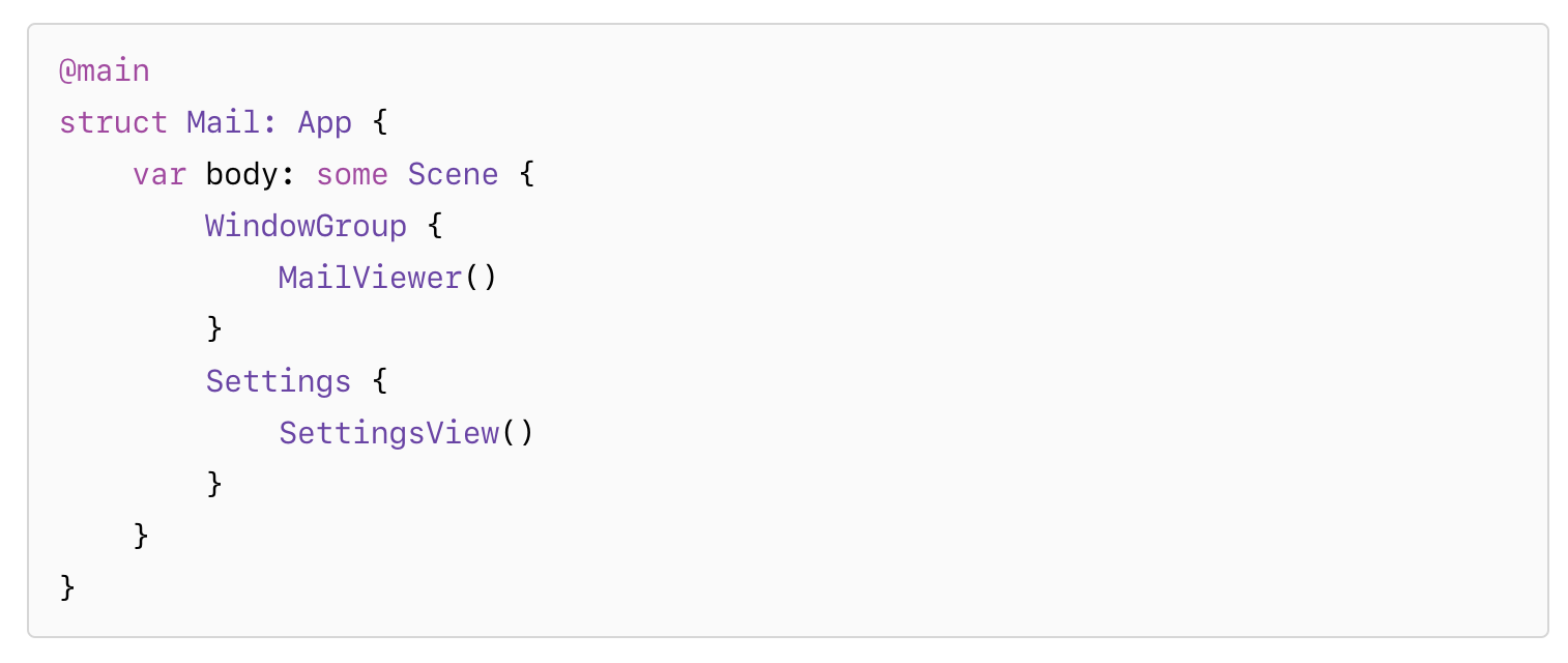 SwiftUI는 구체적인 Scene 타입을 제공하며 이는 문서, 세팅 등을 표현하기 위한 공통의 시나리오들을 처리합니다. 아래와 같이 App 프로토콜을 준수하는 구조체 내부에 커스텀 Scene를 을 생성할 수 있습니다.