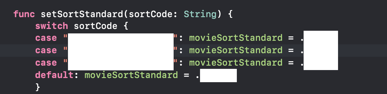 위의 경우가 대표적인 예입니다. sortCode에 구조체의 String형 멤버변수를 넣게 되어 사용하는 분류기준 셋팅 함수인데요. 그냥 생 String형 변수가 인자값으로 들어가 Switch분기를 맞이하게 되는 상황, default: 분기가 함께하며 조금 찜찜한 상황이 되었습니다. 자 그렇다면 이 경우 Enum을 대신 활용하게 될 경우 생기는 장점을 바로 보겠습니다.