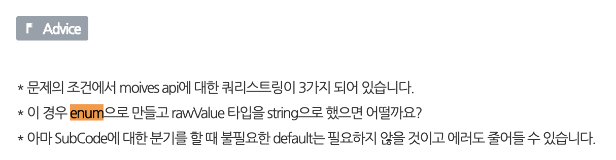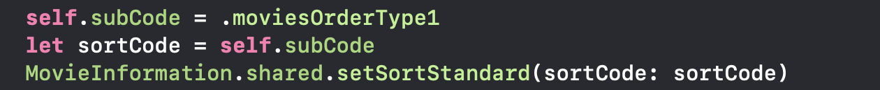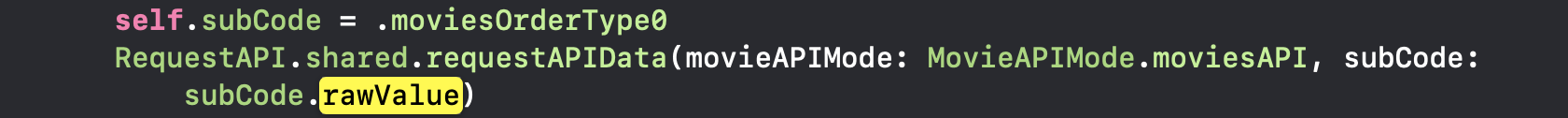 위 이미지처럼 처럼 subCode(enum변수).rawValue의 형식으로 현재 필요한 현재 enum분기에 맞는 날값을 활용하고 있는 것을 보실 수 있습니다.