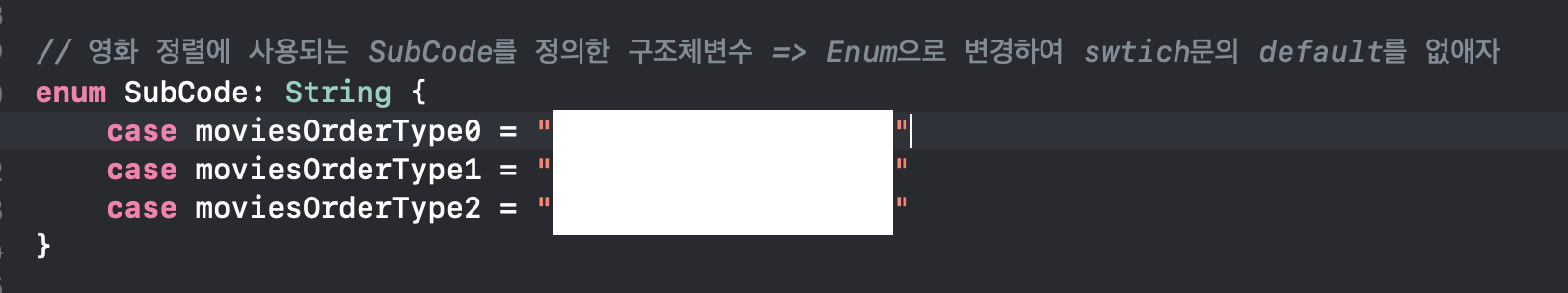 아까 전 SubCode 구조체를 enum 열거형타입으로 변경했습니다. String rawValue(enum의 분기 별 값의 날 값 데이터)는 이전 구조체에서 선언한 String SubCode값이 되었습니다. 크게 변경한 것도 없이 이렇게 enum형으로 선언이 되었지요. 이제 이어서 enum switch문을 활용한 예시를 보여드리겠습니다.
