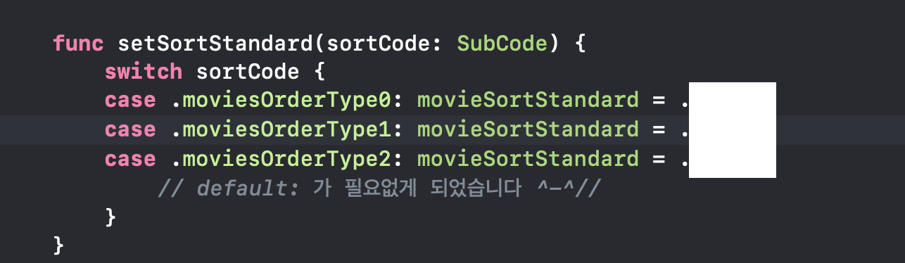 그것은 바로! Enum Switch문 혼용으로 default분지를 제거하고 깔끔하게 코딩을 짜내는 방법입니다. 초보자분들은 유용하게 활용 가능하실 겁니다. Enum이 Swift에선 정말 자주 사용되기 때문입니다.