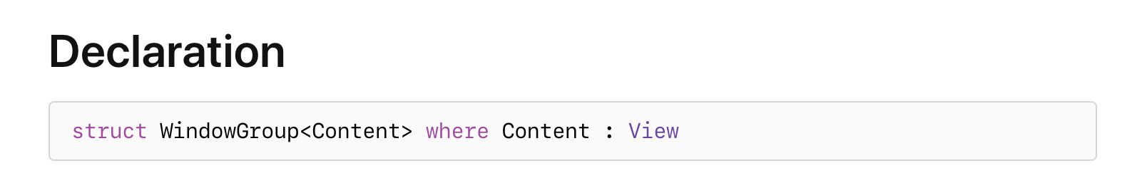 WindowGroup의 선언방식입니다. WindowGroup은 구조체로 되어있으며, View타입의 Content를 갖습니다.