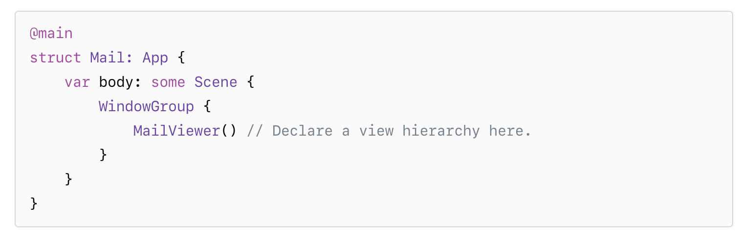 개요당신의 App에 표현 될 뷰계층을 위해 사용되는 컨테이너(Container)가 WindowGroup입니다. 그룹 컨텐츠로서 선언하는 계층은 앱이 그룹으로부터 생성하는 각 Window의 템플릿 역할을 하게 됩니다. 아래 코드는 WindowGroup 블럭 내에 뷰계층을 선언하는 예시를 보여줍니다.