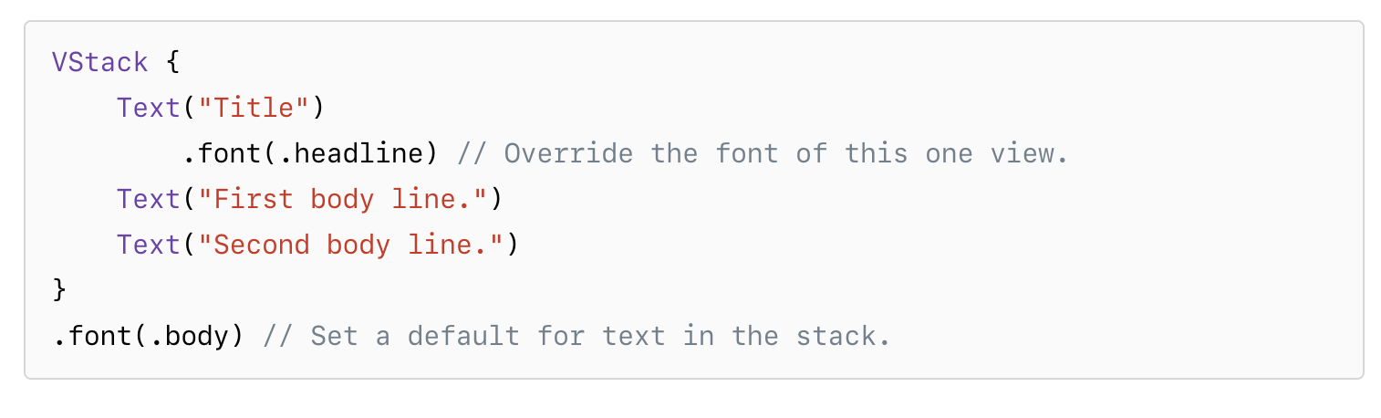 위의 코드를 보면, VStack 내부의 text가 존재하는 서브뷰에만 명시적으로 font(_:) modifier 메서드를 적용하는 것을 알 수 있습니다.