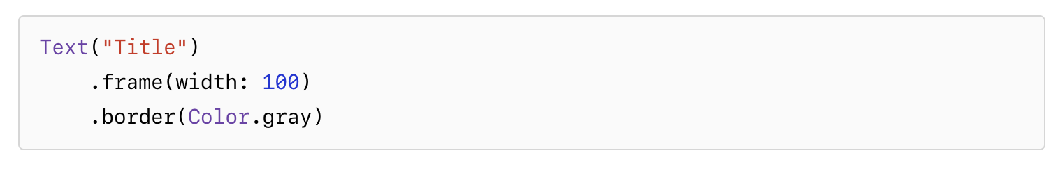 그 예시로, Text 뷰를 보이지 않는 박스로 감싸는 작업을 frame(width:height:alignment:) 메서드로, 해당 뷰의 외곽선을 그리는 작업은 border(_:width:) 메서드로 적용할 수 있는데 이 두개의 modifier 메서드를 체인 방식으로 적용시킬 수 있습니다.