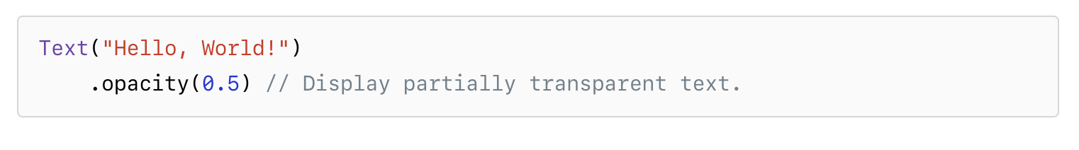 그 예시로, Text View의 투명도를 설정하기 위해 opacity 라는 modifier 메서드를 사용할 수 있습니다. 그 사용 예시는 아래와 같습니다.