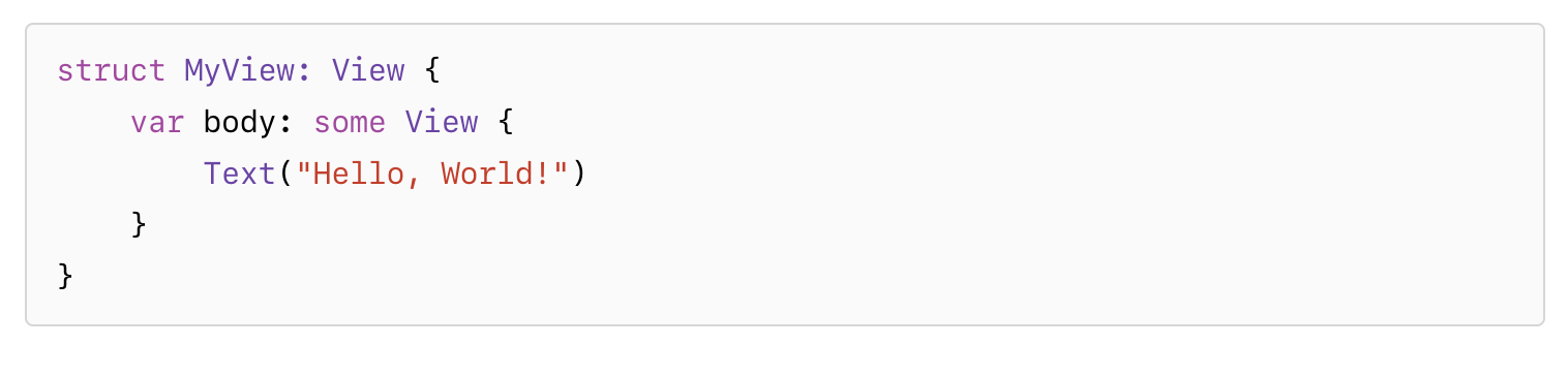 그 예시를 위의 코드를 통해서 볼 수 있습니다. 위의 코드는 View 프로토콜을 채택한 MyView 내에 body를 구성하고 body 내에서 Text 인스턴스를 사용하고 있습니다. 이 외에 추가적으로 뷰의 계층에 다른 커스텀 뷰들을 넣어 사용할 수도 있습니다.