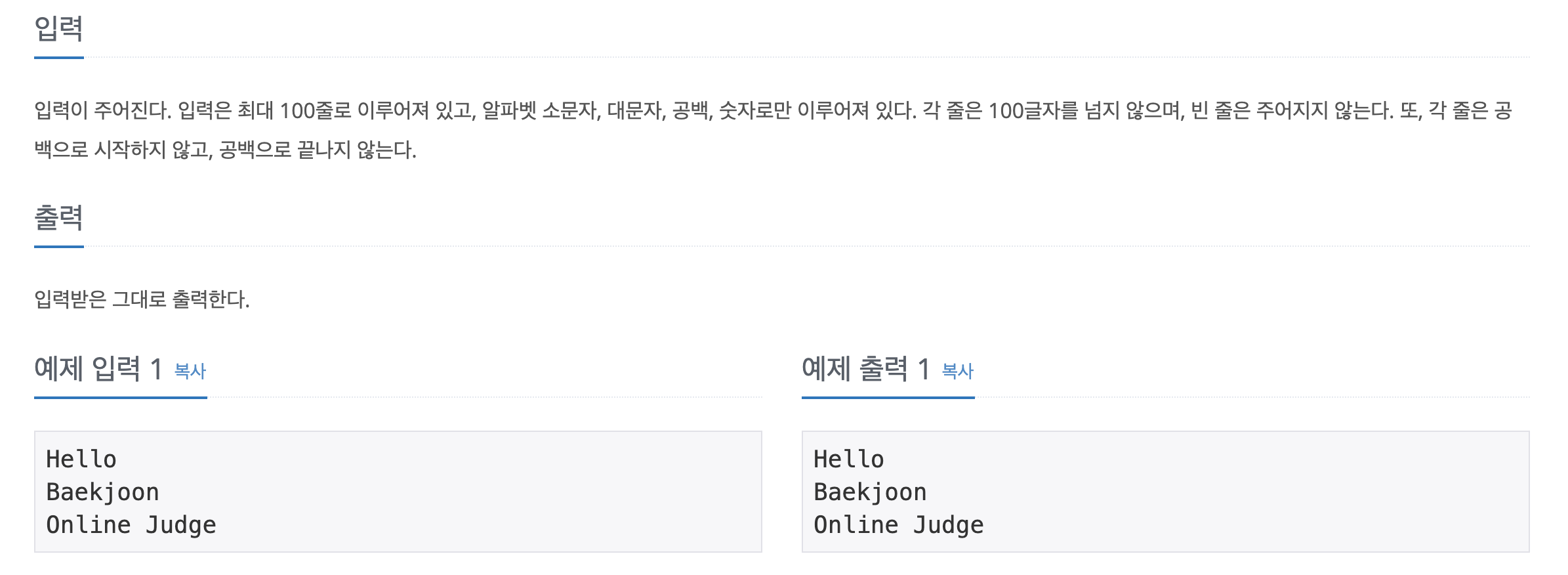 그 방법을 알아보고, 실제 백준 알고리즘 문제에 적용해보겠습니다. 이번에 다루게 될 문에는 그대로 출력하기 문제입니다.
