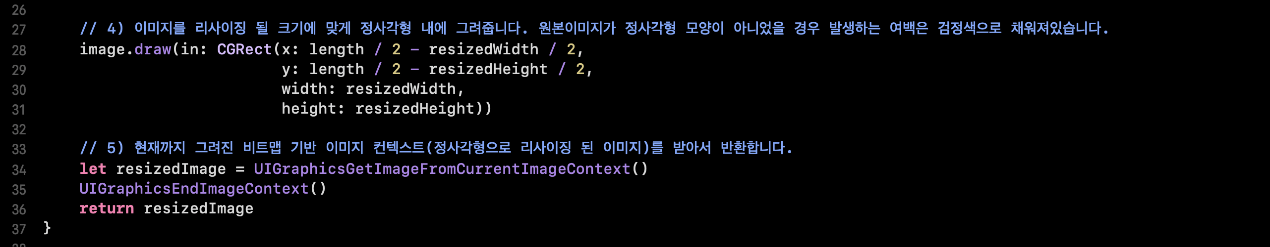 해당 이미지, resizedImage를 반환하고 메서드 구현부는 종료됩니다.이렇게 메서드 구현은 끝났습니다. 👍🏼