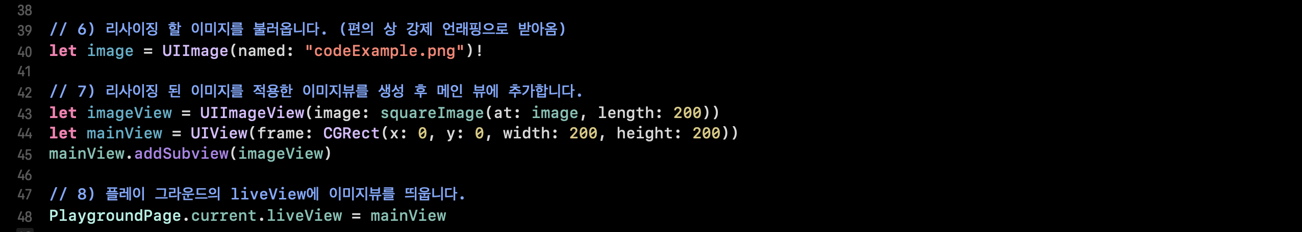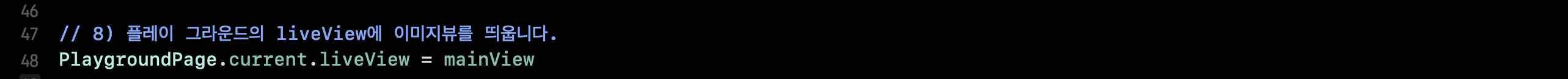 위의 코드에서는 200x200 크기의 비율로 조절된 이미지를 이미지뷰에 넣어주며, playground의 liveView에 띄워질 mainView의 서브뷰로 해당 이미지뷰를 추가합니다.