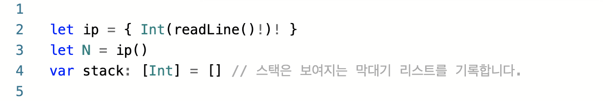5) 그렇게 최종적으로 [Int] 타입의 stack 배열에는 우측 측면에서 보이는 막대기의 리스트만 남게 됩니다.