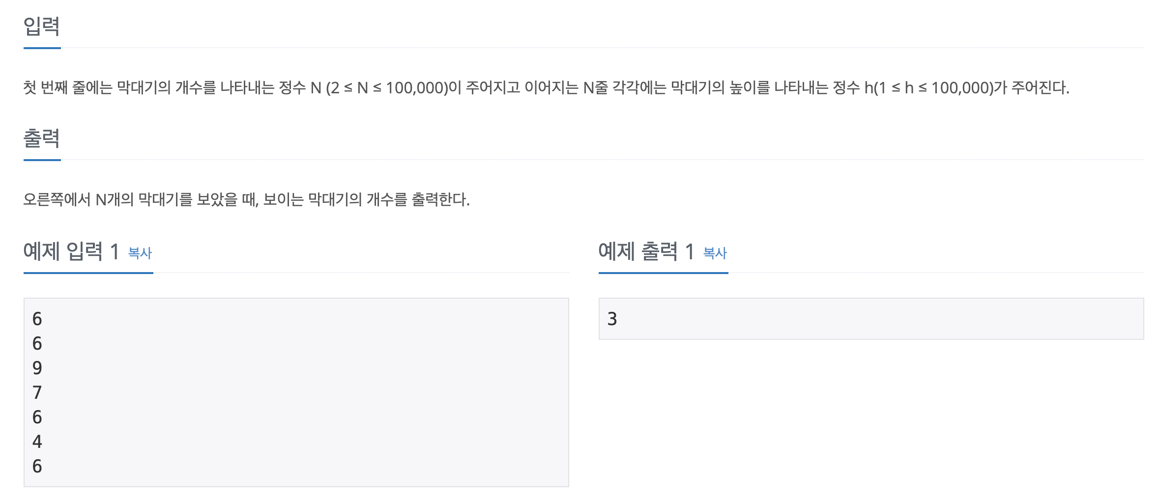 백준 17608번 문제, 막대기 문제는 브론즈2 티어의 입문수준 문제입니다.