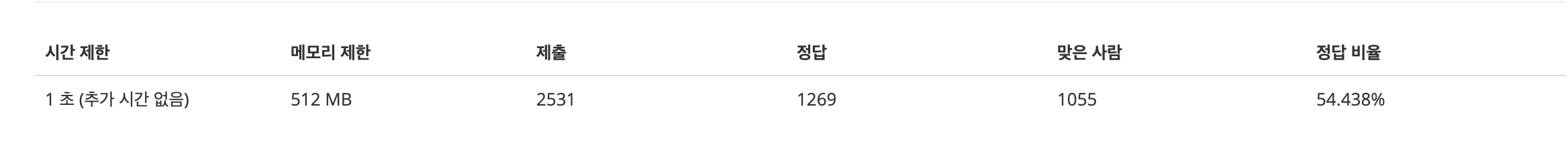 시간 제한은 1초(추가 시간 없음) 으로 1억개 이하의 연산으로 끝내주어야 합니다. 정답비율은 54.438%입니다.