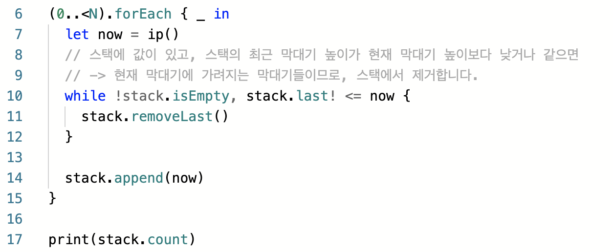 4) 이때 스택의 직전 높이(stack.last!)가 현재 막대기 높이보다 낮거나, 같다면 제거해줍니다.(removeLast())현재 막대기 높이보다 낮거나 같은 막대기들은 현재 막대기에 의해 가려질 것이기 때문입니다.