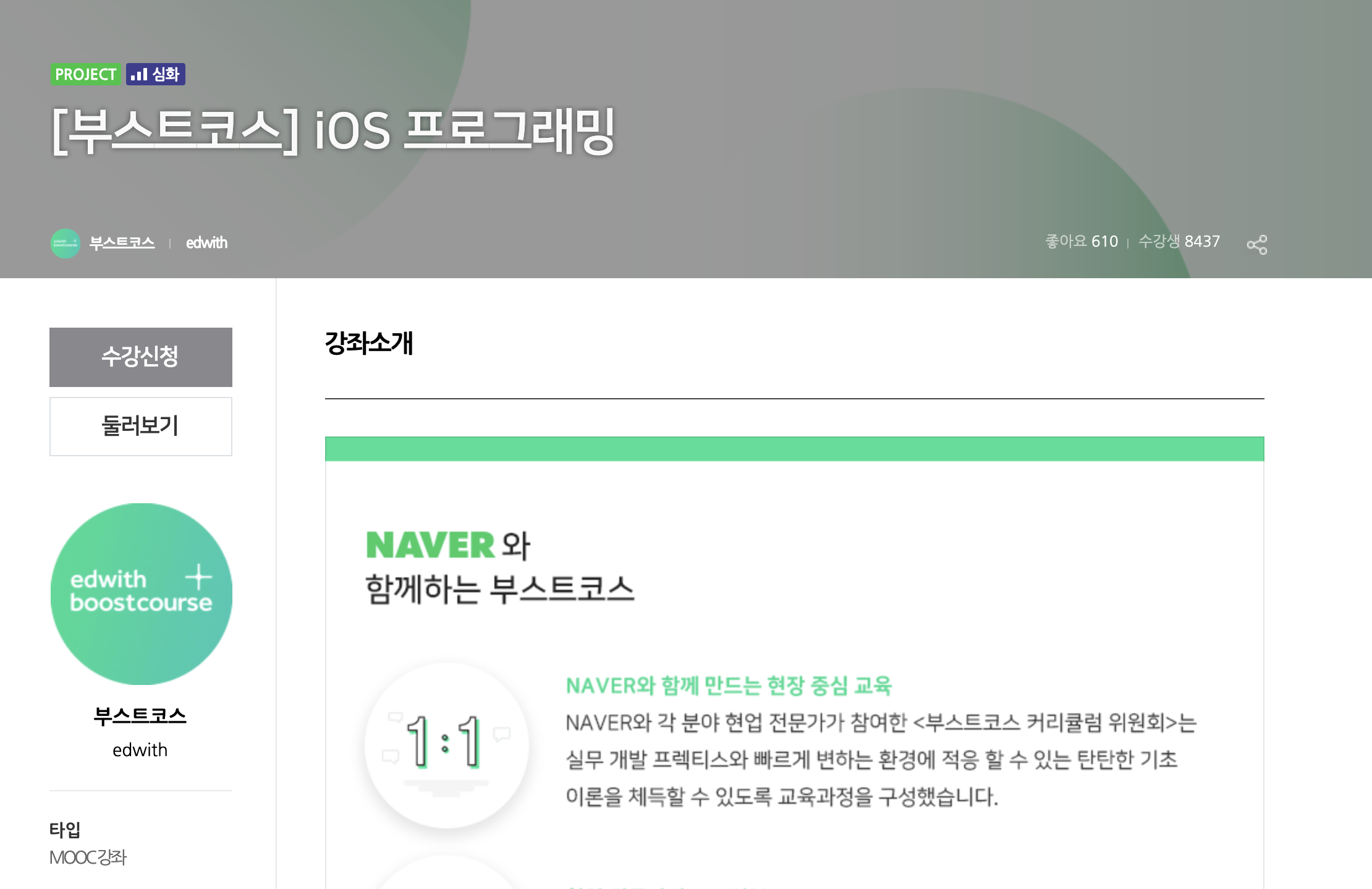 부스트코스 iOS개발 교육과정의 장점이라면 네이버의 비영리제단에서 만든 교육과정으로 공신력이 있고, 수료자에 대한 다양한 행사 지원, 실무형 인재임을 어필할 수 있는 점이 있겠구요.