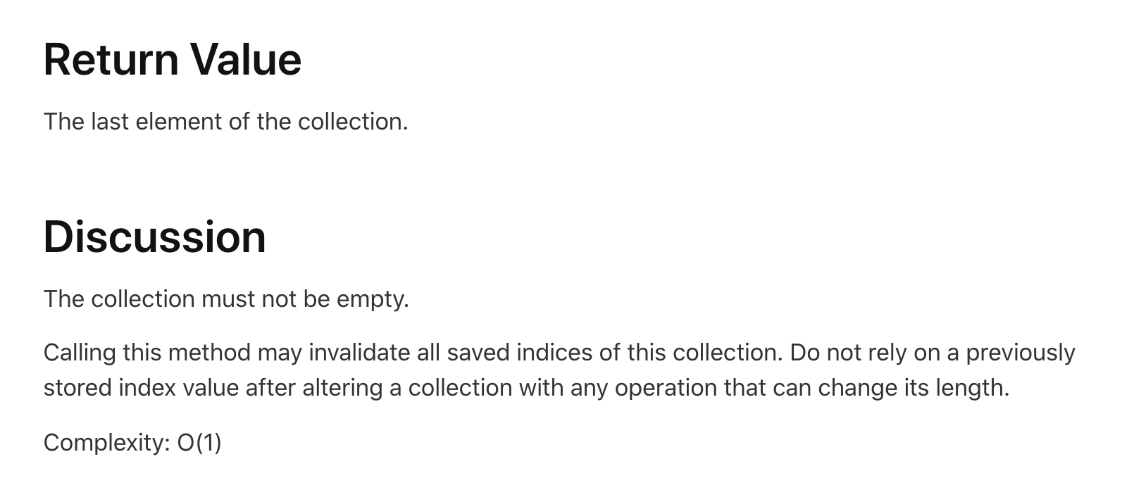 이부분은 가령 배열을 큐처럼 사용하려 할때 무심코 pop()을 removeLast() / push()를 removeFirst(_:) 처럼 사용할 수 있는데 이러한 시간복잡도 상 성능을 잘 이해하고 푸셔야 할겁니다.